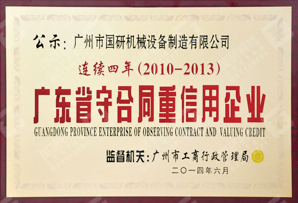 2014年7月,廣州市國研機械設備制造有限公司獲得由廣東省工商行政管理局授予的2013年度“廣州省守合同重信用企業”榮譽稱號。這是公司連續多年來多次獲此殊榮。