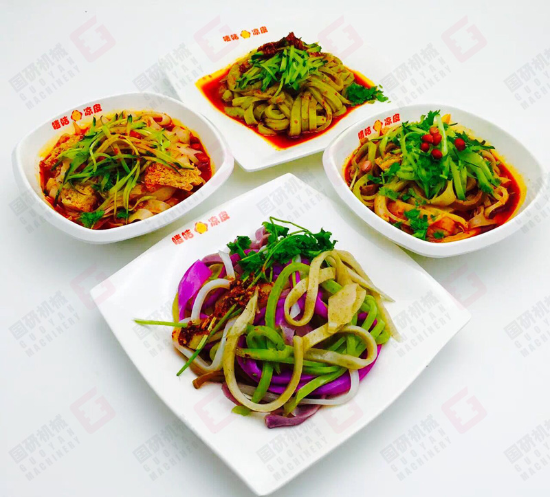 在經濟高速發展和食品越來越多元化的今天,涼皮機如果只能生產涼皮一種產品將難以在市場上立足。國研多功能河粉機可根據不同的配置(例如可加裝拉腸粉機頭、卷粉機頭、自動切片,自動切條等多種方式)和原料出產不同樣式的產品,可直接倒入面粉打槳就可生產出面皮,釀皮;面粉經過洗面后可生產出涼皮和面筋;大米磨槳則可生產河粉、潮汕粿條、江西燙皮、貴州卷筒粉、云南切粉、漢中米皮、綦江米粉、筷子粉等;除此之外還能生產以玉米、紅薯、綠豆等淀粉類粉皮、扁粉、拉皮等等產品。國研多功能河粉機真正實現一機多用,適合不同客戶需求,銷售市場更廣闊!