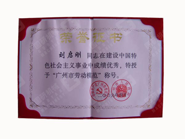 4月28日上午,廣州市委大禮堂張燈結彩、鑼鼓喧天,一派喜氣洋洋。廣州市委、市政府慶祝“五一”國際勞動節暨勞動模范和先進集體表彰大會在這里舉行。廣州市國研機械設備制造有限公司市場部經理劉啟剛同志作為天河區6萬多家民營企業唯一當選的廣州市勞動模范出席了表彰大會。廣東省委常委廣州市委書記朱小丹、市長張廣寧等省市領導親自為劉啟剛等勞動模范頒發廣州市勞動模范獎狀和榮譽證書并合影留念。