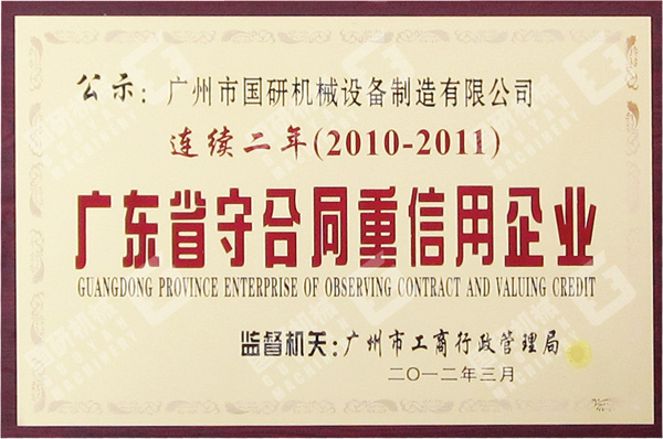 2012年3月,廣州市國研機械設備制造有限公司被評為2011年度“廣東省守合同重信用企業”。這是我司繼連續三年被評為“廣州市守合同重信用企業”之后,連續兩年獲此殊榮。