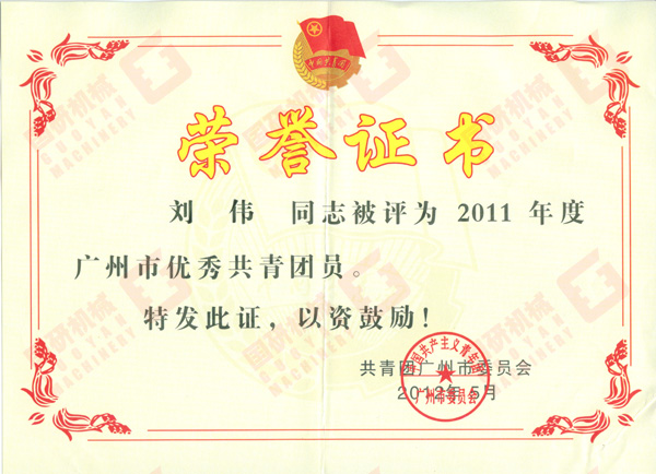 2012年6月,國研機械公司劉偉同志被共青團廣州市委員會評為“2011年度廣州市優(yōu)秀共青團員”。